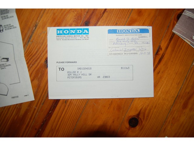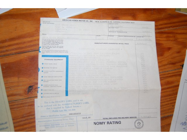 Up for auction is an all original 1979 Honda Accord CVCC with 34K Original Miles.  This car is HEAVILY documented with original paperwork as well as maintenance records.  You will be hard pressed to find another car anywhere that has this pedigree.  I literally have every piece of original paperwork you can think of.  This car was sold new at Colonial Imports in Petersburg, VA on December 11, 1978 for $6,249 and was garage kept in Petersburg until 2011. A 1964 Cadillac was taken in on trade.  As you can see the original invoice is hard to read.  The car has all standard options, some in which I found interesting for the year.  This CVCC is equipped with DIGITAL Transmission Indicator, Tachometer, Fuel Reserve Warning Light, Oil Change Warning Light, Tire Rotation Warning Light, and a Oil Filter Change Warning Light.  I thought these were innovative features for 1979, ahead of its time.