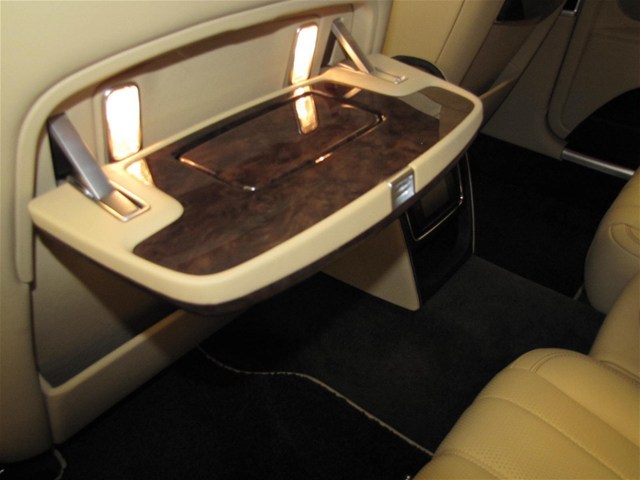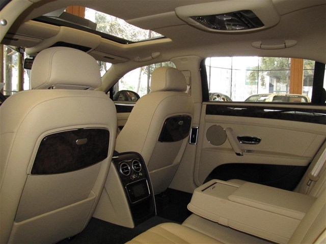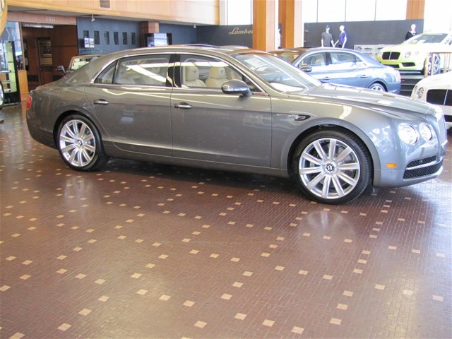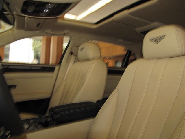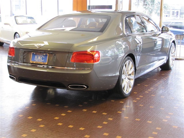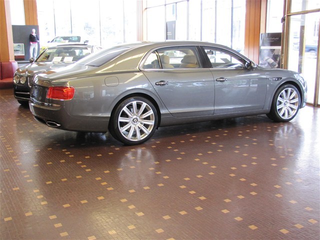 2014 Bentley Flying Spur with Granite/Saffron MSRP $231715 deep pile overmats to front and rear space saving spare wheel single tone three spoke hide trimmed steering wheel veneered picnic tables with vanity mirrors steering column mounted gear selectors electric glass sliding and tilting sunroof rear view camera contrast binding to carpet overmats battery charger contrast stitching 21 ten poke propeller wheels painted emboidered Bentley Emblems to headrests stitching on steering wheel is contrast color