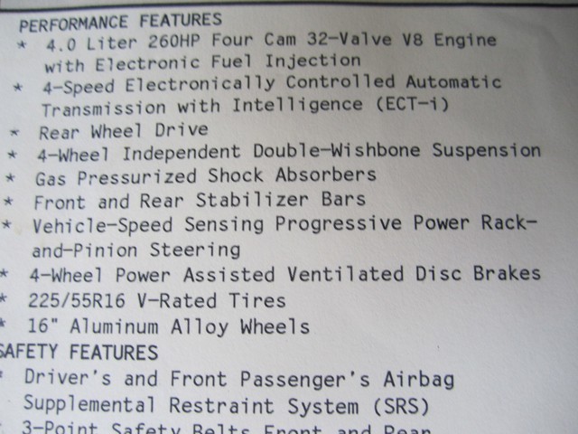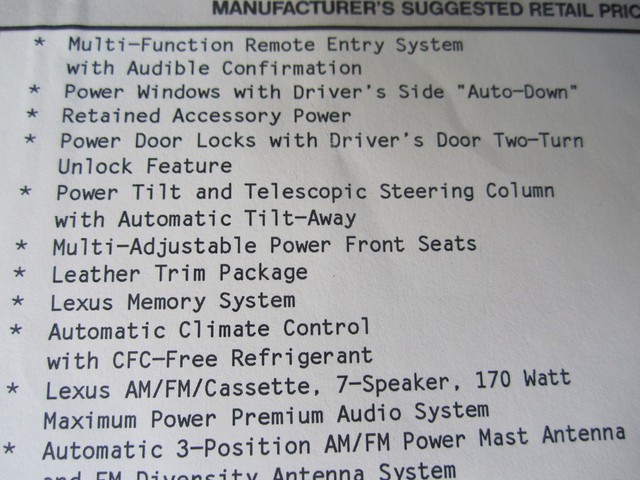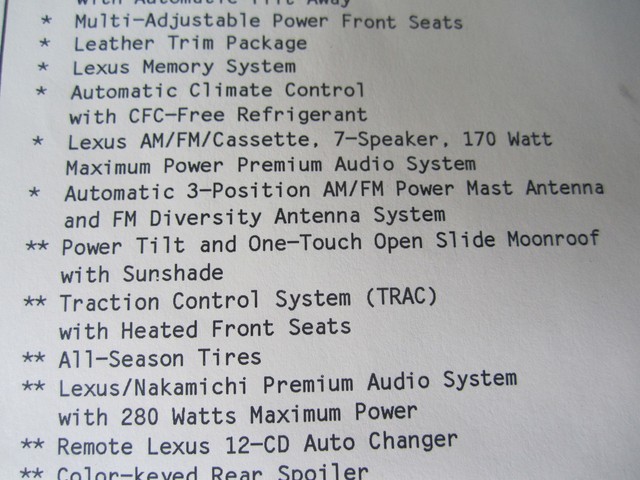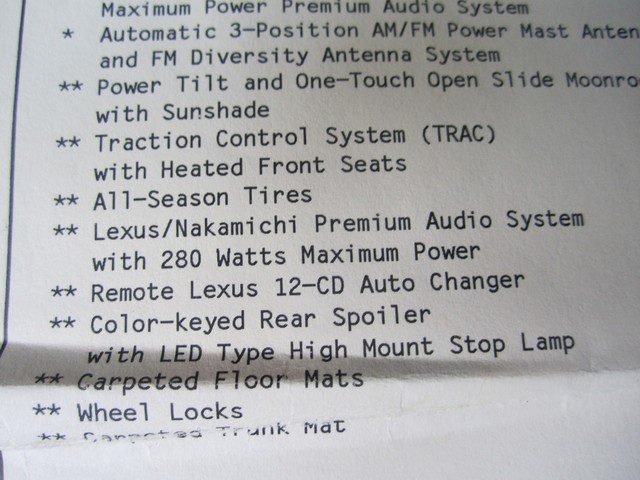 ****************PLEASE WATCH THE VIDEO AT THE END OF THIS DESCRIPTION**************ABSOLUTELY GORGEOUS 1996 LEXUS SC400 V-8 THAT IS JUST IMMACULATE...ONE ELDERLY OWNER (FL SNOWBIRD RETIRED DOCTOR) THAT BOUGHT IT BRAND NEW AND HAS BABIED IT EVER SINCE...(HIS WIFES CAR)...THIS BEAUTIFUL LEXUS HAS BEEN JUST PAMPERED SINCE DAY ONE...IT HAS ALWAYS BEEN DEALER SERVICED AT "LEXUS" AND HAS HAD THE TIMING BELT SERVICED DONE AT (LEXUS OF WEST PALM BEACH) JUST 12K MILES AGO, AND IT HAS JUST BEEN SERVICED, AND FOLKS IT RUNS AND RIDES AND DRIVES LIKE IT DID BRAND NEW, IT IS AMAZING HOW NICE IT IS...IT HAS NEVER BEEN IN AN ACCIDENT, CLEAN CARFAX AND AUTOCHECK, NEVER BEEN SMOKED IN, AND LOOKS TO HAVE NEVER EVEN BEEN EATEN IN, OR CUSSED IN:)....THE INTERIOR IS IN EXCELLENT CONDITION, IT LOOKS FANTASTIC, AND EVERYTHING WORKS PERFECTLY, VERY HARD TO FIND ONE OF THESE WITH THE BLACK INTERIOR, AND TO FIND ONE LIKE THIS IS ALMOST IMPOSSIBLE...THE EXTERIOR IS ALSO IN EXCELLENT CONDITION, AND THE BEAUTIFUL "PLATINUM METALLIC" FACTORY PAINT LOOKS AND SHINES LIKE BRAND NEW...NO DINGS OR DENTS JUST A COUPLE OF MINOR IMPERFECTIONS BUT NOTHING THAT TAKES AWAY THE BEAUTY OF THIS AMAZING CAR...THE FACTORY ALLOY WHEELS ARE AWESOME HAVE SOME VERY NICE "GOODYEAR" TIRES ON THEM WITH PLENTY OF TREAD REMAINING...THE "LEXUS/NAKAMICHI" PREMIUM AUDIO SYSTEM SOUNDS AMAZING IT WILL BLOW YOU AWAY SOUNDS FANTASTIC...YOU WILL GET ALL THE BOOKS AND MANUALS THAT CAME WITH IT BRAND NEW, YOU WILL GET ALL 3 KEYS, AND IT EVEN HAS THE ORIGINAL "WINDOW STICKER"...$58,614.00 WAS THE PRICE OF THIS TOP OF LINE LUXURY SPORTS CAR BACK THEN AND IT STILL LOOKS AND RIDES AND HANDLES LIKE IT DID BRAND NEW, IT IS VERY RESPONSIVE AND QUICK, THE CAR HANDLES LIKE IT IS ON A RAIL, YOU WILL LOVE HOW THIS CAR DRIVES AND RIDES...IT IS A "DIVINE FIND" AND YOU WILL LOVE THIS CAR...PLEASE WATCH THE VIDEO AT THE END OF THIS, AND TAKE A LOOK AT ALL THE PICTURES...IF YOU HAVE ANY QUESTIONS PLEASE GIVE US A CALL, JACK 727-460-4283 OR CAROL AT 727-798-7161 OR EMAIL US...THANK YOU GOD BLESS YOU AND HAVE A GREAT DAY...IT MAY HAVE SOME MORE MILES ON IT BEFORE THE END OF THE AUCTION, I LOVE TO DRIVE THIS ONE:)