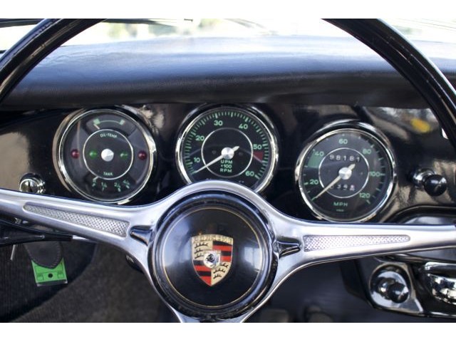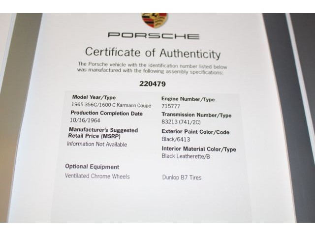 Up for sale is a very nice original 1965 Porsche 356c Coupe, garaged California car with 100% solid original undercarriage, numbers-matching, low 98,200 original miles, one owner since 1968.  Original black/black color combination and a real California Black Plate Car.  VIN 220479 and engine number 715777. Clear California Title