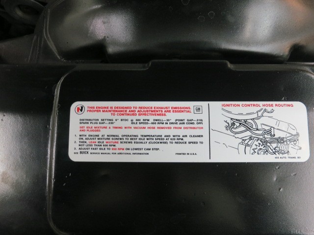 SPEC'S : LENGTH: 225.8” ,WIDTH: 80”, CURB WEIGHT: 4,450 LBS, WITH FUEL/COOLANT: 4,644 LBS. WHEEL BASE: 126.2”, ENGINE: 455 CU IN. V-8, 370 HP RATIO: 10:1 RPM: 4100-6300- BORE: 4.3125, FUEL CAP. 25 GALLONS ,CARBURETOR: ROCHESTER 4 BBL,POSITIVE TRACTION AXLE ,AM-FM RADIO W/FACTORY 8 TRACK PLAYER, WHITE WALL TIRES, AIR CONDITIONER - MANUAL CONTROLS ,SPEED ALERT &TRIP ODOMETER,DOOR GUARDS,REMOTE CONTROL OUTSIDE REAR VIEW MIRROR, ELECTRIC DOOR LOCKS, MIRROR MAP LIGHT,BODY MOLDINGS , RIM-BLOWER STEERING WHEEL..... STANDARD EQUIPMENT: 3-SPEED TURBO HYDRA-MATIC 400 TRANSMISSION - POWER STEERING - POWER BRAKES - CUSTOM PADDED CUSHIONS - TRUNK LIGHT -COURTESY LIGHTS - ELECTRIC CLOCK -SUPER DELUXE WHEEL COVERS - POWER WINDOWS , 2 WAY POWER SEAT.