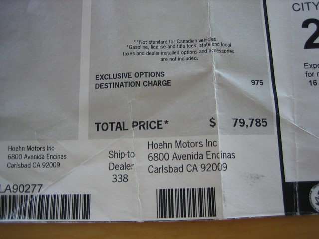 There will be additional charges for California government fees and taxes, any finance charges, any dealer document preparation charge, and any emission testing charge.  Buyers residing in states other than California are responsible for temporary permits, processing fee and any applicable taxes, registration, emission tests, and license and title fees for the state in which they reside.