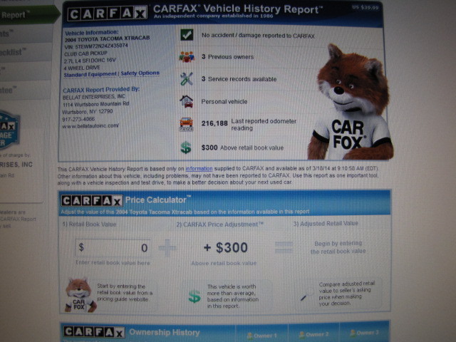 Up for sale is this well kept, maintained and taken care of, clean, never in accident 2004 Toyota Tacoma SR5 4WD 2.7L 4 Cylinder Extended Cab with Automatic Transmission. Clean truck with clean Carfax report. This Tacoma's exterior is clean of any noticeable dents or scratches. Minor dings and minor buffable scratches may be found through out the body of the vehicle for normal wear and tear. Interior is very clean, with no stains and no foul odor. Non-smokers vehicle. Everything is there and works fine including 4WD and A/C. Mechanically this Toyota truck is in great shape. No mechanical issues, No warning lights on, no electrical problems, no leaks of any kind, no rust issues. Good brakes and rotors. New Tires!! Serviced and inspected. Ready to go. For any questions call us at 917-273-4066 Thank you.