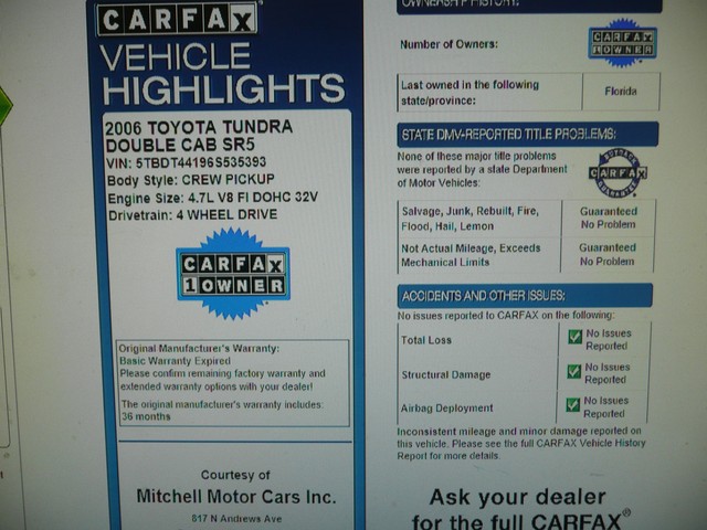 You are Looking at a 1 Owner Exceptionally Clean 2006 Toyota Tundra SR-5 Double Cab 4x4 With a 4.7 Litr V-8 and Automatic Transmission.