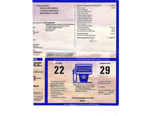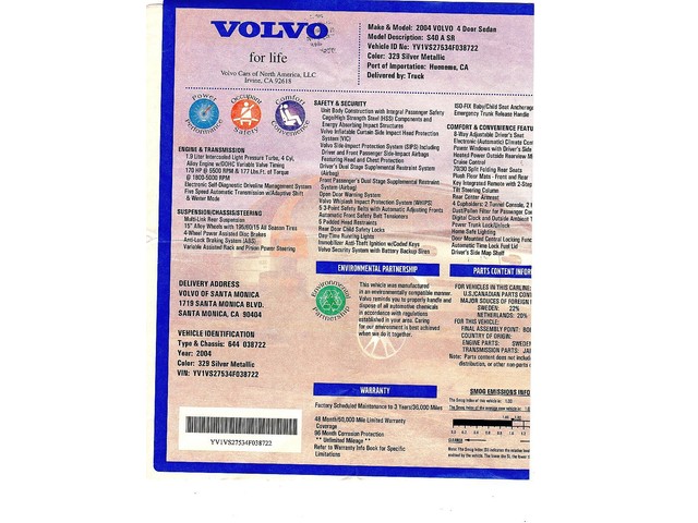The interior of the vehicle is very clean and well appointed with driver 8-way power front seat and manual passanger seat. The rear seat passengers are not left out and kept very comfortable with plenty of leg and head room. The driver is treated to a leather trimmed tilt / telescoping steering wheel with controls to the premium 7-speaker audio system, cruise control, climate control and onboard computer all within easy reach. The vehicle is equipped with numerous safety and convenience features that include but are not limited to: 1-Touch Power Glass Sunroof, Onboard Multifunction Computer, 60/40 Split Fold Rear Seat for tons of cargo space & Factory Keyless Entry. The vehicle is also equipped with 4 wheel ABS, Traction Control, Optional 16” factory alloy wheels and Volvo's legendary SIPS Side Airbag Protection. The S40 has a BRAND NEW set of Goodyear Eagle LS 205/55/16 tires that were just fitted plus there is a new/unused mini-spare in the cargo area with a complete set of tools. This S40 will come (1) master remote key, a Complete set of Factory Owners Manuals and the original $28,607 window sticker!!