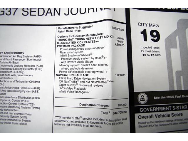 Please do not hesitate to contact us, by phone at, Toll Free - 1-800-960-0225 or Local - 817-239-7712 with any questions. Ask For Allen! You can also email us (Allen@HileyLuxuryAndSport.com) with any questions. 1-Owner, 2012 Infiniti G37 Journey Sedan. This Infiniti is in "as new" condition inside and out with full factory bumper-to-bumper warranty remaining, and has been adult-owned, driven, and appears garage kept. In addition, we have all the original owner's manuals, 1 key with 1 remote, and the original window sticker. Features include: Premium Package, Navigation System, Leather Interior, 17" Alloy Wheels, Heated Front Seats, AM/FM/XM/CD Player With Premium Bose Audio System, Power Moonroof, Rearview Camera, And Much More. This is a fantastic Infiniti with numerous features. A sure to please. This vehicle is in "as new" condition inside and out. There are no dimples, dents, depressions, scrapes, nor scratches anywhere. The paint is in fantastic condition as is the trim grill, bumpers, glass etc. The alloy wheels are in "as new" condition with no abrasions, and the tires are in "as new" condition. The interior of this vehicle has no rips, tears, burns, stains, nor worn spots on the seats, carpet, door panels, nor anywhere else. This Infiniti has passed the NON-smoker smell test. It drives and looks like new.