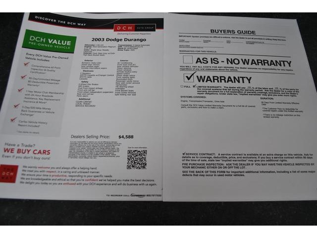 CLEAN CARFAX!, LOCAL TRADE!, And SERVICE RECORDS!. Yes! Yes! Yes! You Win! There is no better time than now to buy this good-looking 2003 Dodge Durango. New Car Test Drive said it "...features big-rig looks to back up its off-road capability...a good choice for large families. Its theater-style seating arrangement gives rear passengers a view of the road ahead..." With plenty of passenger room, you won't have to worry about being cramped when it's more than just you in the SUV. This Durango is nicely equipped with features such as 4WD, CLEAN CARFAX!, LOCAL TRADE!, And SERVICE RECORDS!.