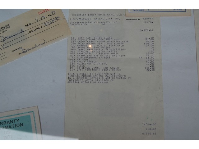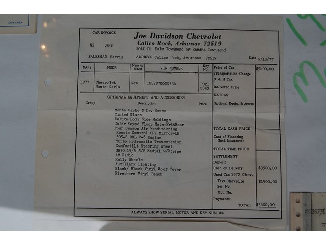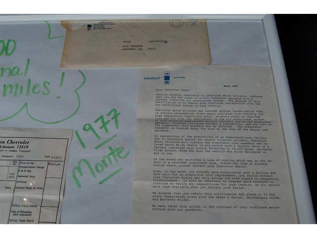 Sold new at Joe Davidson Chevrolet in Calico Rock, Arkansas this 77' stickered out at $5400.00. I have just about every piece of original paperwork you can get; Car Invoice, Dealer Order Sheet, Warranty Pamphlet, Broadcast Sheet, Original Letter From Letter, VIN # Warranty Card, and a bunch of maintenance records.  This heavy documentation is hard to find and adds significant value to any collector car.