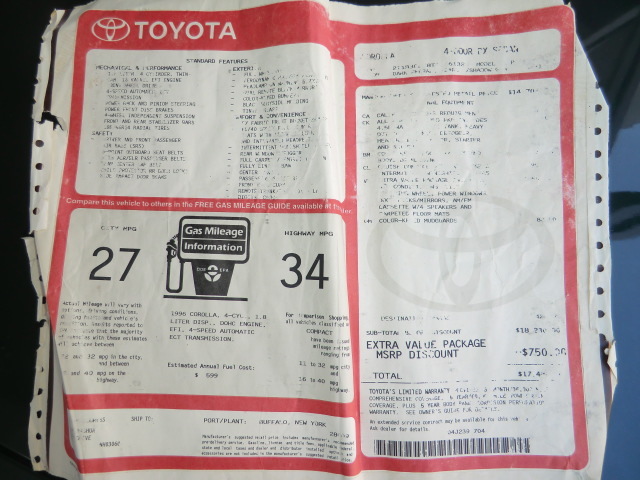 1996 TOYOTA COROLLA DX 1.8 FOUR CYLINDER ENGINE, ONE OWNER CAR, ORIGINAL 48K PAMPERED MILES, ORIGINAL STICKER, ORIGINAL BOOKS, GARAGE KEPT, ALL ORIGINAL CAR, WHERE ARE YOU GONNA FIND ANOTHER ONE LIKE THIS ????