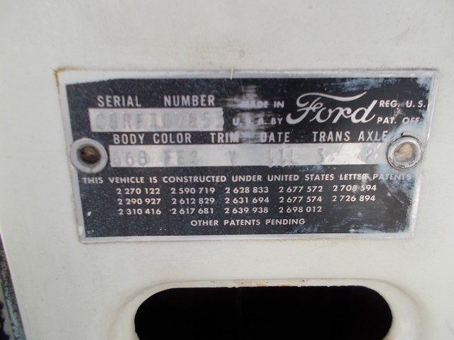 SOME OF THE DATA TAG READS 66B FOR RANCHERO CUSTOM, FE PAINT FOR SILERTONE GREEN/COLONIAL WHITE, # 3 FOR 3.56 GEAR NON POSI. IST LETTER IN VIN IS C FOR 292 ENGINE.