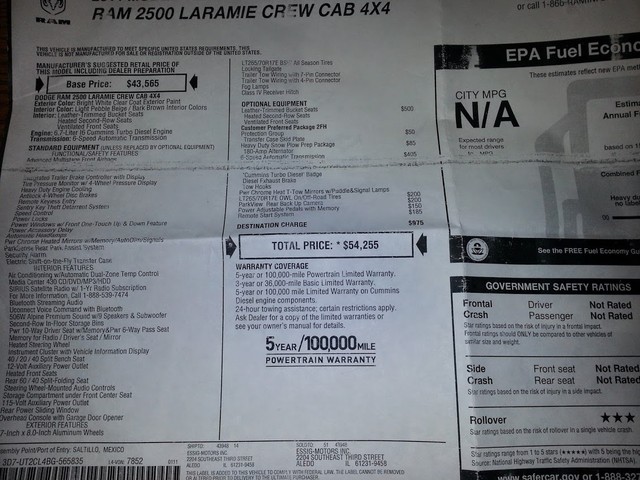 Fresh Trade... 2011 Dodge RAM 2500 LARAMIE CREW CAB 4x4 6.7L I6 cummins turbo diesel, 6 speed automatic transmission, heated leather seats (front and second row) remote start, backup camera, B&W turnover ball, remainder of 5 year 100,000 mile powertrain warranty. ONE owner clean carfax.  Don't delay call today!