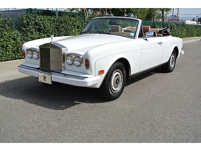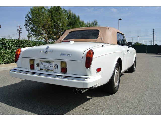 Lovely 1994 Rolls Royce Corniche IV convertible. Completed in a White exterior with Tan leather interior, tan top and white contrast piping. Believed to be a one owner car, clean Car-fax history, complete with all tools, manual book, boot cover, and battery charger system installed. Has been well kept and it shows. Drives excellent, and just serviced. Interior and exterior are in beautiful condition. Has been dealer serviced and comes with records, gentley driven an average of only 2,700 miles per year. As a Corniche IV is has a fully power top with uatomatic latches glass rear window, Corniche IV's are getting harder and harder to come by as they are the last of the true Corniches.   Call for complete details.