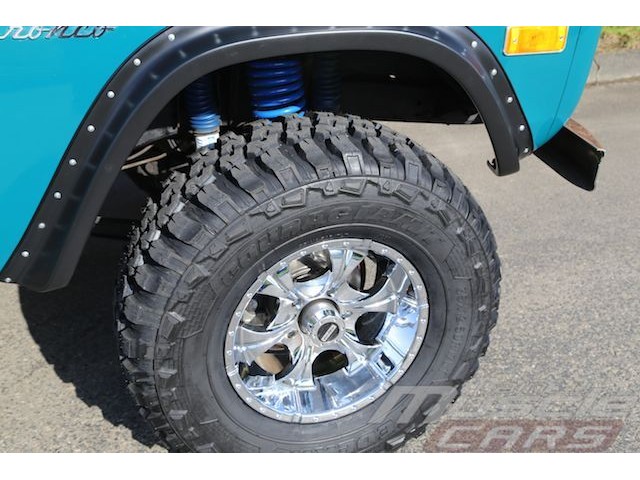The suspension has been upgraded with a 3 1/2" suspension lift. Longer front springs, urethane bushings, heavy duty shocks and heavy duty rear springs. It allows the use of 35" tires for a substantial increase in ground clearance while giving this Bronco an aggressive look.