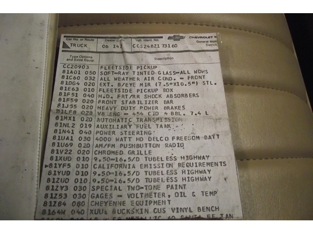 This 78 Cheyenne C20 has the original STRONG - OPTIONAL code "28" 454 CID V8 that was COMPLETELY REBUILT ($2,500) in it and it is running very well. Sounds good too with the Flowmaster style dual exhaust system! The engine is backed by a smooth three speed automatic transmission which also functions very well. The all original bronze and tan interior is VERY NICE and has the OPTIONAL - CHEYENNE trim level including a NICE Original recovered Buckskin Tan bench seat, NICE dash, NICE original dash pad, NICE original gauge cluster, NICE original sun visors, NICE original door panels and a nice original steering wheel. The truck an awesome Alpine model CDE-121 AM/FM/CD/MP3/USD digital stereo with Alpine 2-way speakers in front and Pioneer 6X9” 3-way speakers in the back and it sounds awesome. This truck is nicely equipped including power steering, factory heavy duty power brakes, dual factory fuel tanks, original dual folding Chrome and stainless exterior mirrors, WORKING A/C, good heater and defroster and 3-point seat belts and sliding rear window. This truck is a great running and wonderful looking Pickup. This 78 Cheyenne C20 3/4 Ton Camper Special has sharp looks and TONS power as well! These vehicles have an appreciative group of owners any of which would be pleased to own this one. The suspension and drive line seem to be in good working order as well as the electrical system.