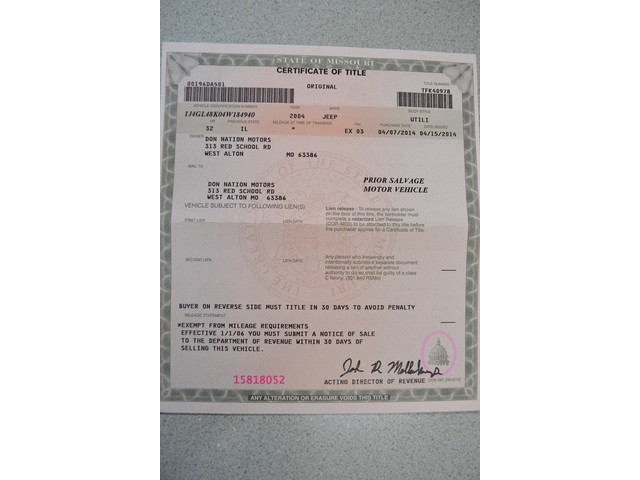 This 2004 Jeep Liberty "Columbia Edition" was totaled out by the previous owners Insurance company(State Farm)and will be an easy repairable for personal use or resale.  The title will be a Missouri "Prior Salvage" title that will be in my name with a Bill of Sale signed over to you that can be used to register in your state, no salvage inspection needed with a prior salvage title.  Both front and back of title can be seen in pictures at end of listing.
