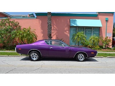 beautiful custom plum crazy purple paint job, black accenting stripe, power budge hood, vinyl roof, Go-wing rear spoiler, chrome sport mirrors, custom bucket seat interior, console with cup holders and B&M shifter, Grant steering wheel, working factory AM/FM radio, A/C, finished off trunk with matching full size spare wheel. You won't see another one with the eye appeal this Charger has, Don't miss this great looking B Body Mopar!!!