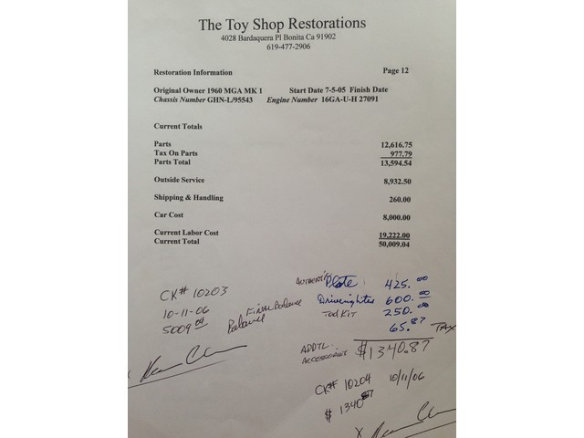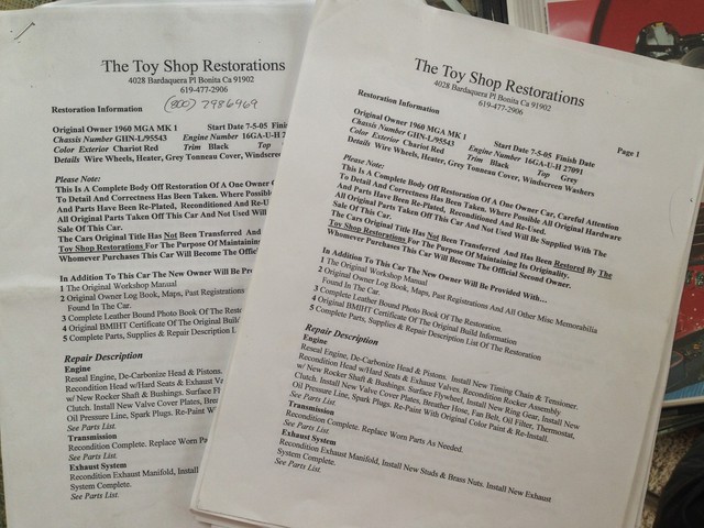 The MG A was bought new in Connecticut from Faiola Brothers Cars in Farmington, CT on January 2, 1961 by Mr. Keith McKee. Mr. McKee was enlisted in the Navy and enjoyed the MG A for 40 years!  By 1964, Mr. McKee had moved to Gunnison, Colorado and then later to San Diego, CA.  The present owner and our client, Randy Lockett, bought the MG A from Mr. McKee in 2005.  The title from 1964, Mr. McKee's hand written journal documenting all service and repairs (included with the sale).