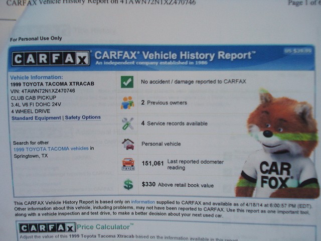 NO RESERVE.  1999 Toyota Tacoma SR5 V6, 4X4, Extended Cab with a 5-Speed manual.  She has Power Windows, Power Locks, Factory Crusie Control and a Toyota brand Bed-Liner.  Great Color Combination and a 2-Owner with a Perfect Carfax and Dealer Serviced with timing belt changed, new tires, recent alternator changed and radiator flush.  Super Clean and dry undercarage and no accident history; only a few small dings and some minor paint chips.  Clear Texas Title and ready to drive and enjoy daily.  This truck does not have a tow hitch and I was told she was not used to tow and was never used for any off-roading.  The only flaw I found was the driver seat has the seperation from getting in and out as most Tacoma's have. I have personaly driven this truck for a few thousand miles and she drives great. NON-Smoker owned.  Call Ron at 682-333-7433 with any questions.