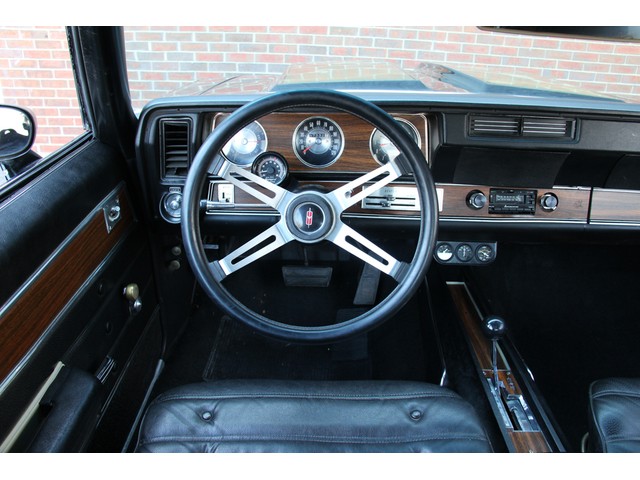 Power is provided by an original numbers matching 455 cubic inch Oldsmobile V8 that is all original and not rebuilt to our knowledge. Has a 10-bolt rear-end stamped W 27 and big, 3.73 gears. The car also retains its original double A-arm front and 4-link rear suspension. It also features correct power steering and a correct rear sway bar. And at the corners, 14-inch Magnum 500s, Firestone Fire hawk SS p245/60r14, with power-assisted brakes.