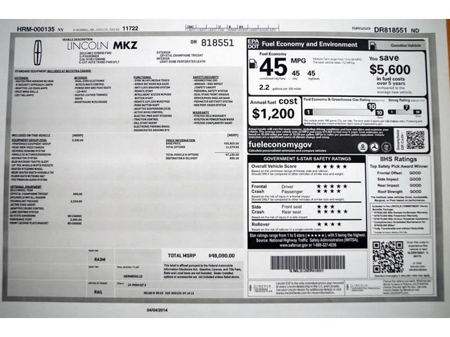 Features include: 2.0L Hybrid I4 Engine, Technology Package, Navigation System, Leather Interior, 19" Polished Aluminum Wheels, Heated Front And Rear Seats, AM/FM/CD Player With Premium THX Audio System, Power Panoramic Moonroof,Rearview Camera, Lane Keeping System, Adaptive Park Assist, Rear Parking Sensors, And Much More.  This is a fantastic MKZ with numerous features.  A sure to please.