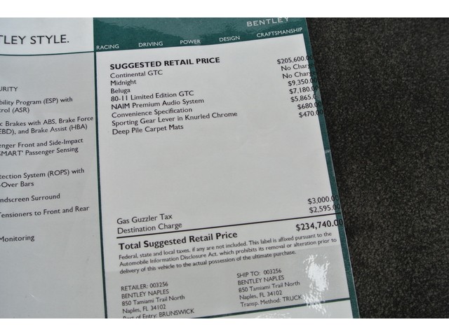 Rare special edition 80-11 2011 Bentley GTC. Midnight metallic black exterior with Beluga Black leather interior. 1 OWNER car and only 9,758 original miles! LOADED with options including NAIM premium audio system ($7,180 option) 80-11 limited edition package ($9,350) , Convenience specification ($5,865) , sport gear shift knob ($680) deep pile floor mats ($470) original window sticker $235,000!! Navigation, K-40 Radar system, blue tooth, Aluminum and Piano wood interior, White contrast stitching and piping, drilled aluminum pedals, power trunk, all books, two keys, Sirius radio, back up camera, bright matrix grills, and so much more! Just had the 3 YEAR SERVICE completed 30 miles ago! Absolutely beautiful through out, just traded in for a new Bentley and ready to be enjoyed anywhere! Call for complete details! Buy with confidence from a Rolls Royce and Bentley Specialist! Classic Motor Inc. Rolls Royce and Bentley Sales and Service (818)988-1045 pst. MANY MORE ROLLS ROYCE AND BENTLEYS IN-STOCK NOW! SERIOUS BIDDERS ONLY PLEASE!
