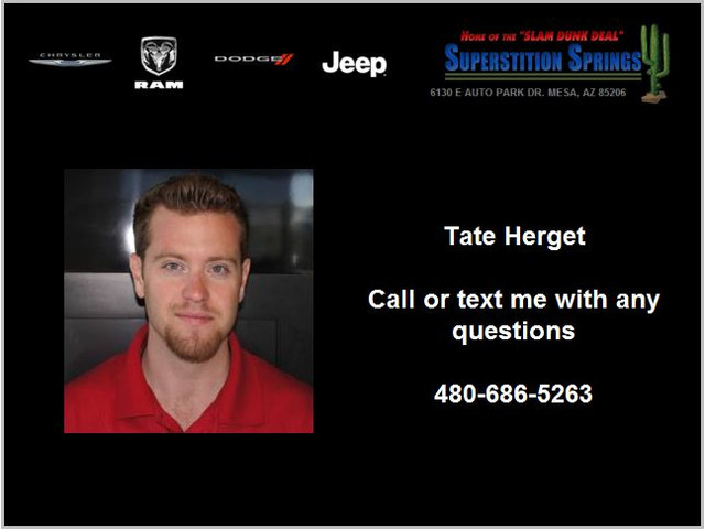 My name's Tate Herget. I'm the internet manager here at Superstition Springs C,J,D. I do my best to represent these cars the best I can. I have a large invintory to manage, and mistakes happen... Before Hitting the Buy it now, or before you bid, Please call me. I want all my customers to know what they are buying. If you have any questions about this or any of my other auctions please feel free to contact me via e-mail- therget@supercj.com or you can call or text me on my cell- (480)686-5263, Thank you for your interest and I look forward to hearing from you.