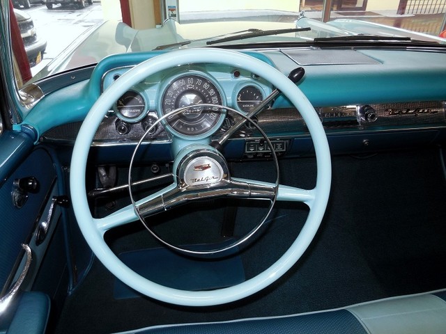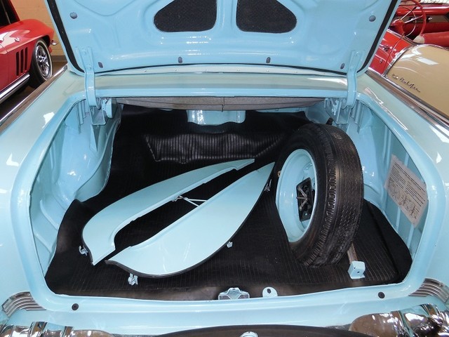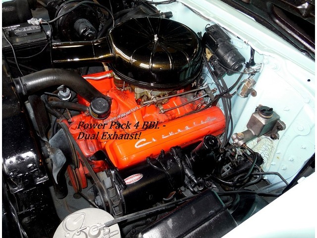 She's equipped with the original Power Pack 283 4 bbl. engine and correctly mated to a Power Glide automatic from the factory. Great sound flows out through dual exhaust with sport mufflers. Steering is made delightful with factory Power Steering. Power top makes dropping the top a breeze, factory fender skirts to dramatically change the look of the car, beautiful Continental kit, factory AM radio that works perfect after it warms up!