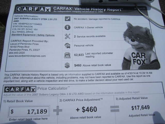 ***************PLEASE WATCH THE VIDEO AT THE END OF THIS DESCRIPTION********ABSOLUTELY GORGEOUS 2007 SUBARU OUTBACK LIMITED "LL BEAN EDITION" 2.5 AWD 4X4...1 FL OWNER, RUNS AND RIDES AND HANDLES LIKE BRAND NEW, CLEAN CARFAX, BEAUTIFUL COLOR COMBINATION, LOOKS AND SHINES LIKE NEW. THE INTERIOR IS IN EXCELLENT CONDITION, IT LOOKS LIKE BRAND NEW, NEVER BEEN SMOKED IN AND LOOKS LIKE IT HAS NEVER EVEN BEEN EATEN IN, AND I DON'T THINK IT HAS EVEN BEEN CURSED IN...IT LOOKS FANTASTIC, LIKE NEW. THE EXTERIOR IS ALSO IN FANTASTIC CONDITION AS WELL, THE TWO/TONE PAINT IS GORGEOUS, LUGGAGE RACK, FACTORY MUDFLAPS, IT EVEN HAS A VERY NICE "HIDDEN TOW HITCH" WITH IT, AND THE FACTORY 17" WHEELS LOOK GREAT. THESE SUBARU'S ARE JUST AN AMAZING AUTOMOBILE, THEY RUN, RIDE AND HANDLE EXTREMELY WELL, VERY SAFE, VERY RELIABLE, AND VERY VERY POPULAR, AND THESE "AWD'S" ARE GREAT IN ANY TYPE OF WEATHER, AWESOME IN THE SNOW, MUD. RAIN, WHATEVER THE CONDITION THIS SUBARU WILL GET YOU THERE SAFE AND SOUND. THEY ARE FANTASTIC ON GAS AND CAN GET UP TO 33 MPG ON THE HIGHWAYS, YOU WILL JUST LOVE THIS VEHICLE THEY ARE AWESOME TO DRIVE, AND A PRIVILEGE TO OWN. THIS BEAUTIFUL SUBARU HAS NEVER BEEN IN THE SNOW, NO SALT OR RUST ON IT ANYWHERE, THE UNDERNEATH OF IT LOOKS AS NICE AS THE REST OF IT. YOU ALSO HAS A LOT OF OPTIONS WITH THE " LIMITED PREMIUM PACKAGE" THAT COMES WITH THIS, 17" ALLOY WHEELS, LIKE NEW CONTINENTAL TIRES, PANORAMIC SUNROOF, 6DISC CHANGER, HEATED SEATS, DUAL POWER SEATS, IT EVEN HAS 4 WHEEL DISC BRAKES. THE VERY QUICK 2.5 LITER ENGINE IS VERY VERY DEPENDABLE AND RELIABLE, YOU ALSO GET "LIMITED SLIP REAR DIFFERENTIAL". YOU EVEN GET  ALL THE BOOKS AND MANUALS IT CAME WITH BRAND NEW, TWO KEY FOBS, ONE KEY. THE NEW OWNER IS GOING TO LOVE THIS "OUTBACK". **********PLEASE WATCH THE VIDEO AT THE END OF THIS DESCRIPTION AND TAKE A LOOK AT ALL THE PICTURES********IF YOU HAVE ANY QUESTIONS PLEASE GIVE US A CALL 727-460-4283 OR 727-798-7161 OR EMAIL US. I HAVE PUT A LOW RESERVE ON IT AND I HAVE IT FOR SALE LOCALLY AS WELL, PLEASE GIVE US A CALL AND I WOULD BE HAPPY TO TELL YOU WHAT YOU CAN BUY IT NOW FOR OR WHAT THE LOW RESERVE IS, GOD BLESS YOU AND HAVE A FANTASTIC DAY:)