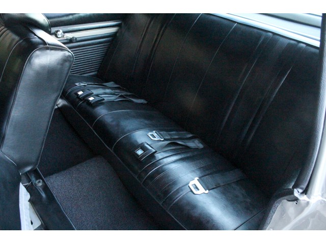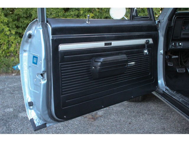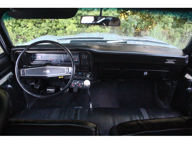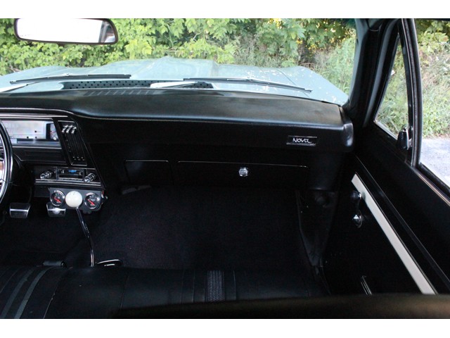 Regardless of what motor made its way into the sub frame, the Nova always stayed true to its economical roots. No place was that more evident than the interior. The inside of this ’70 model stays true to that formula with only the bare essentials in place. Seating is provided by a nicely recovered black vinyl bench with simple black door panels featuring an off white appliqué strip at either side. From the driver’s seat, a showroom quality dashboard places nothing more than a speedometer and fuel gauge and factory tachometer in the cluster. The previous owner choose to add a set of aftermarket gauges (volt, oil, and water) to the underside of the dash just to keep an eye on that high dollar engine. At either side of the cluster, there are controls for items like the ventilation system, headlight switch and push button AM/FM radio and a nice JVC head unit that’s been hidden nicely in the glove box for some real sound. A Factory SS two spoke steering wheel with a black Chevrolet horn buttons at either end & the lockable steering column. Bright pieces such as the window cranks and door handles look brand new as does the headliner. At ground level, fresh black carpet it protected by floor mats, and new fresh door-sill plates. To the rear of the cabin, a utilitarian trunk retains its utilitarian factory style and perfect condition with the correct jack and spare tire in place.