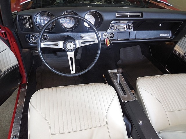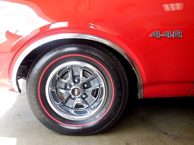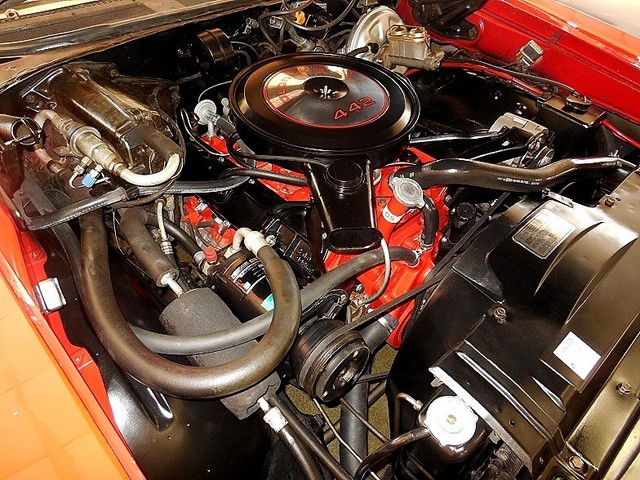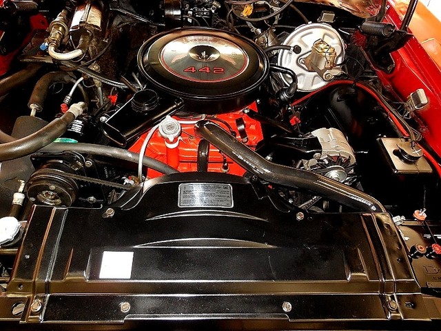 She's equipped with a proper 1968 442 engine 400 / 350hp. (very smooth - Very Strong ) and correctly mated to the matching numbers Turbo 400 automatic from the factory. Great sound flows out through dual exhaust with the 442 Trumpet Tips. Steering is made delightful with factory Power Steering. Stopping with the factory Power Brakes is wonderful, Power top makes dropping the top a breeze, cold factory A/C for those super hot days, modern stereo system, comfortable bucket seats with console and floor shift!