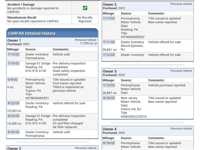 We often use these services to check a vehicles background.  Carfax and Autocheck are wonderful services,  but they have their limitations.  Many times they will show more “owners” than we may state a vehicle has had.  This is because they are an information service only.  They have never seen the car, owned the car,  and have no other information about the car than what is reported from different agencies.  All of this information is originally hand entered into their databases at their source and mistakes and inconsistencies will occur !  For example when a dealer such as ourselves purchases a vehicle they may pick it up as a new owner when this is of course not the case as dealers are not end users.  Also they often contain mileage errors and inconsistencies that appear to make little sense.  Just like any computer generated information report you need to know how to read the report & when to read between the lines. Having seen thousands of these over the years we can help you understand the information listed in these reports,  just ask.
