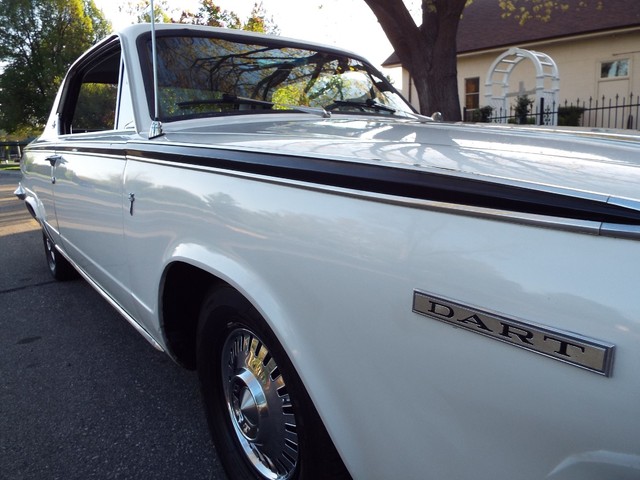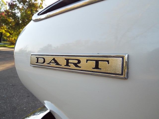 This BEAUTY has what appears to be the STRONG - ORIGINAL - Code "L" - 273 CID - "Commando" V8 Motor in it and running very well. The  motor also still retains it's ORIGINAL intake manifold, ORIGINAL exhaust manifolds, ORIGINAL Carter carb, ORIGINAL Valve covers and the ORIGINAL air cleaner housing. Sounds good too with the "Throaty" true dual exhaust system with dual chrome tips ! The engine is backed by an VERY RARE - REBUILT - SMOOTH - 4 Speed manual transmission with a floor mounted Hurst shifter that also functions very well. The previous owner had the transmission professionally rebuilt recently including a brand new clutch and they have less than two hundred miles put on them since. The MOSTLY ALL FACTORY ORIGINAL !! - Code "P4X" - Dart GT ONLY Black vinyl bucket seat interior is in VERY NICE condition with VERY NICE ORIGINAL Black  vinyl front bucket seats, VERY NICE ORIGINAL Black vinyl rear bench seat, VERY NICE White vinyl sunvisors, NICE ORIGINAL White vinyl headliner, good ORIGINAL Black Dart GT steering wheel, VERY NICE ORIGINAL matching Black vinyl and Chrome accented door panels, VERY NICE Black carpeting, VERY NICE ORIGINAL gauge clusters including a 110 mph speedometer, NICE ORIGINAL Black and silver dash and a VERY NICE ORIGINAL Black vinyl dash pad with two very small cracks. In my opinion your not going to find a much nicer mostly factory original interior in a 48 year old car than the one that's in this BEAUTY, UNBELEIVABLE !! The - Code "S" - Ivory White  exterior paint is EYE POPPING BEAUTIFUL showing only several small chips, scratches and imperfections but is still bright and shiny and looks  AWESOME as you can clearly see in the picture and video above and the 100 ADDITIONAL PICTURES  BELOW. The MOSTLY ORIGINAL - Code "P4X" - Black vinyl interior and the contrasting - Code "S" - Ivory White exterior is a GREAT color combination indeed ! How could you get any better !! This Car is a great runner and a real nice looker and is nicely equipped including a factory guage cluster with 110 mph speedometer, chrome sport drivers side rear view mirror, front seat belts, original Dart all transistor AM radio which is no longer working, factory front wing windows, good heater and defroster, factory power wipers and a factory floor mounted FOUR SPEED Hurst shifter.