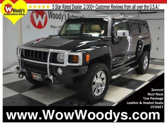 4x4 3.7L I5 Sunroof, Leather & Heated Seats, CD Stereo w/Aux, Running Boards, Tow Package, Roof Rack, Chrome Wheels, Tow Hooks, Certified Warranty. Are you interested in a simply outstanding SUV? Then take a look at this beautiful-looking 2007 Hummer H3. You, out enjoying this fantastic Hummer H3, would be so much better than it sitting here proving nothing on our lot. It's ready, each time and every time. Come let it show you!Price includes $500 instant rebate when financed through a Woody's Lender.Want a custom video? Just text your first & last name and the stock# to 660-247-5319.This vehicle's stock# is 07D927-297 |Check out www.woodyswow.com to see why we're different! Woody's is an Honest, Up-Front, One Price Dealership selling new & used cars in the greater Kansas City area. Check out what over 2000 customers are saying at over2000reviews.com When it comes to Price, we're third party verified among the lowest In The Nation! This vehicle is certified with a **Pre-Owned Warranty** at no cost to you!Not sure which vehicle you want? With the largest 10AcreMegaLot and most diverse inventory in Middle America you can view all makes in one location! Check out our website to see 800+ vehicles, 50+ Pictures, Videos, Free History Reports and more! www.wowwoodys.com You can search by payment, get a trade appraisal, and setup financing all at www.megawoodys.com now or just call us toll free at (888) 881-0393 to schedule a test drive.The majority of our vehicles qualify for Woody's Assurance Program which includes a 12 Month Return Policy, Limitations Apply, See Dealer for Details.Some of our customers say, Help me find a car or just find me a car We can find you any used car, used truck, used suv. Plus, We will pick you up at the airport or ship your vehicle to you! Our award winning Finance Management Team works with over 15 local and national banks to get you the best rate and term. If you would like to save time just visit our www.wowwoodys.com website to access our Trade Appraisal Tool and Online Secure Credit Application. We also offer an online payment calculator so you can setup different down payment/monthly payment options.[Image]