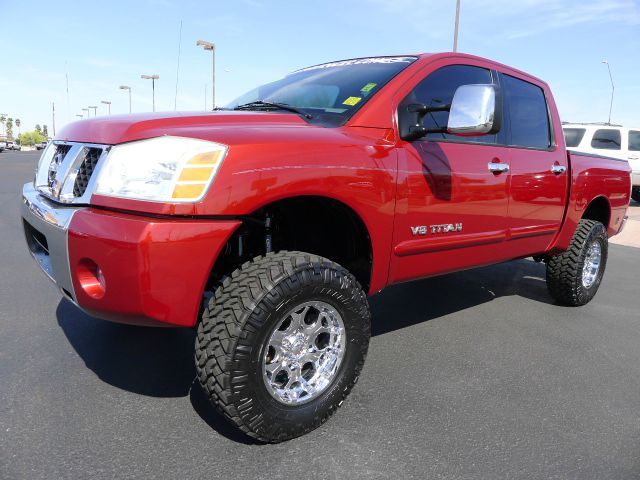 2005 NISSAN TITAN 5.6 LE CREW CAB USED LIFTED TRUCK FOR SALE, FEATURING A PROFESSIONALY INSTALLED OFF ROAD SUSPENSION LIFT, NITTO M/T TIRES ON MKW CHROME WHEELS, HIGH OUTPUT 5.6L V8 MOTOR, GRAY SPORT LEATHER INTERIOR, CENTER CONSOLE SHIFT, ROCKFORD FOSGATE CD CHANGER AND AUDIO, STEERING WHEEL CONTROLS, POWER HEATED SEATS, POWER PEDALS, REAR WINDOW, TOW PKG., BED LINER, TINT, SUPER CLEAN AND NICE INSIDE AND OUT!