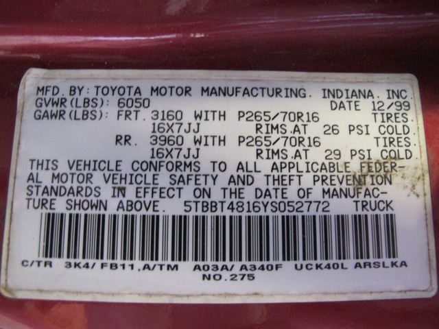 *Mechanical: 4.7L V8 paired with an automatic transmission. The engine runs strong with no issues, the transmission shifts smooth through each gear and the A/C and heat work perfect, and the 4x4 goes in and out of gear with no issues. I would not hesitate to make a cross country run in this Tundra, these things are very reliable.