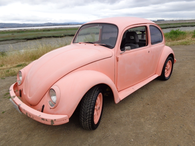 The paint is an awful shade of coral pink and has faded considerably. Even if it were flawless, you'd probably want to re-paint it. Keep in mind the door jambs, underhood, dashboard, wheels, bumpers, fan shroud and accessories are all painted this color as well, so if this isn't your color, your work is cut out for you. There is also small patch of rust beginning at the lower right corner of the windshield, so you might want to patch that while you're at the body shop. Custom touches include one piece windows, shaved door handles, recessed license plate, frenched 40 Ford tail lights, frenched antenna, and empi style wheels.