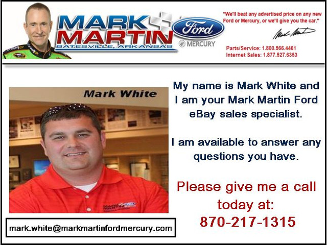 Tired of Haggling? Save time and money buying a vehicle with Mark Martin Ford Mercury. We are your exclusive ROUSH dealer in the area. We are proud to serve the greater northeast and north central areas. When you get ready to buy a car Mark Martin Ford  wants to help you! GOOD CREDIT AND BAD CREDIT our auto loan specialist are there to lend a hand. SO COME IN AND SEE US TODAY OR YOU COULD BE LOSING MONEY!!! Call Mark White 1-870-217-1315.