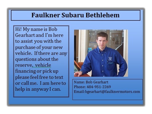 You will be purchasing this vehicle from Faulkner Subaru in Bethlehem PA. The Faulkner Organization, today, consists of 15 dealerships and 13 body shops representing 24 total franchises comprised of four domestic and ten import brands, employing more than one thousand people. We are the largest family owned dealership in PA. I am Bob Gearhart and I will be your Salesperson. Please feel free to contact me at 484-951-2269 via phone or text. I have been selling vehicles in PA for 14 years and will be happy to put my expertise to work for you