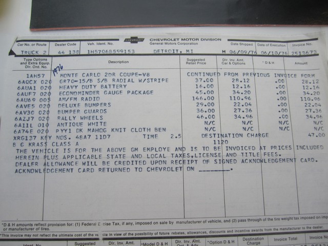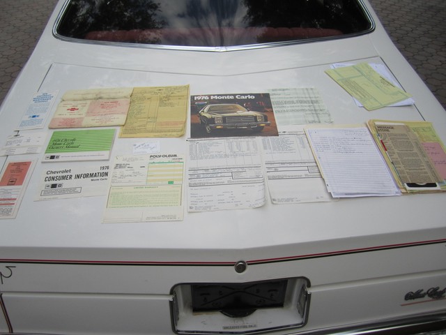 **********************PLEASE WATCH THE VIDEO AT THE END OF THIS DESCRIPTION YOU WILL LOVE THIS CAR******************ABSOLUTELY GORGEOUS 1976 CHEVROLET MONTE CARLO THAT WAS SPECIAL ORDERED BY A "GM EXECUTIVE" BOUGHT CAR FOR HIS WIFE (K.A. KRASS) AND SHIPPED ON 06/09/1976 TO (TED EWALD CHEVROLET CO.) AND PURCHASED ON 06/18/1976...WHAT A FIND, THIS BEAUTIFUL MONTE CARLO IS WITHOUT A DOUBT ONE OF THE MOST WELL DOCUMENTED COLLECTABLE CARS YOU WILL EVER FIND ANYWHERE...THIS GENTELMAN EVEN WROTE DOWN WHEN HE BOUGHT AND USED HIS SPARE TIRE FOR GOODNESS SAKE, I HAVE NEVER SEEN ANYTHING LIKE IT EVER...FOLKS YOU WILL BE JUST BLOWNED AWAY BY HOW NICE THIS MONTE CARLO IS, AND IT RUNS AND DRIVES AND HANDLES LIKE BRAND NEW, I MEAN IT IS AMAZING IT DOESN'T HAVE A RATTLE OR SQUEAK IN IT AT ALL IT JUST FLOATS DOWN THE ROAD WITH A "STATE OF PRESENCE" THAT YOU JUST WON'T FIND ANY MORE, WHAT A FANTASTIC EXAMPLE OF AMERICAN AUTOMOBILE HISTORY...THE INTERIOR IS JUST IN EXCELLENT CONDITION, (OTHER THAN A COUPLE OF LITTLE CRACKS AROUND THE FRONT SPEAKER ON THE DASH) IT ALMOST STILL LOOKS "BRAND NEW" WHEN YOU LOOK INSIDE IT, AND I WAS TOLD IT IS ALL ORIGINAL, EXCEPT FOR THE RADIO AND MATS, YOU WILL LOVE IT, AND I MEAN EVER BIT OF IT...THE EXTERIOR IS ALSO IN EXCELLENT CONDITION, STILL HAS THE ORIGINAL PAINT ON MOST OF IT, AND IT REALLY LOOKS FANTASTIC...THE UNDERNEATH OF IT IS AS SOLID AS CAN BE WITH NO EVIDENCE OF RUST OR CORROSION ANYWHERE...THE ORIGINAL RALLY WHEELS ARE STILL LIKE BRAND NEW, AND ALL THE CHROME AND MOLDINGS ARE LIKE THAT TOO, AND AGAIN FOLKS ALL THIS STUFF IS THE ORIGINAL PARTS THAT CAME ON THIS CAR ALMOST 40 YEARS AGO AND ORIGINAL CHROME AND ALL. THE A/C IS ICE COLD...PLEASE WATCH THE VIDEO AT THE END OF THIS DESCRIPTION AND TAKE A LOOK AT ALL OF THE PICTURES I HAVE TAKEN FOR YOU...IF YOU HAVE ANY QUESTIONS PLEASE GIVE ME A CALL  JACK AT 727-460-4283 OR CAROL AT 727-798-7161 OR EMAIL US...I WOULD BE HAPPY TO TELL YOU WHAT YOU CAN BUY IT NOW FOR...THANK YOU GOD BLESS YOU AND HAVE A FANTASTIC DAY...CONGRATULATIONS ON FINDING THIS ONE IT IS A KEEPER...YOU ARE GOING TO GET SOME MUCH DOCUMENTED PAPER WORK WITH THIS CAR IT IS UNREAL, HOW MUCH THIS MAN LOVED THIS CAR. HE HAS KEEPED EVERYTHING AND NOTED IT ALL AND HAS EVERY RECEPT FOR EVERYTHING HE EVER HAD DONE TO IT, IT LOOKS LIKE...ALWAYS GARAGED AND METICULOUSLY MAINTAINED YOU WILL-NOT FIND ANOTHER ONE LIKE THIS, IT IS A "DIVINE FIND"...I AM GOING TO LIST SOME OF THE THINGS THAT HE SPECIAL ORDERED FROM THE "ORIGINAL BUILD-SHEET".