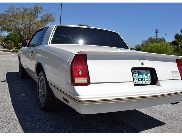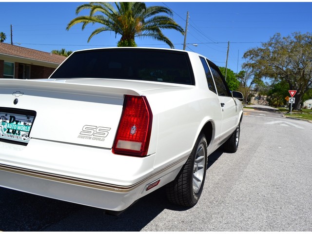 1988 Chevrolet Monte Carlo SS For Sale. 5.0L V8 engine, automatic transmission, power steering, power disc brakes, A/C, 15" factory alloy wheels with Cooper Cobra raised white letter tires, white exterior, lay-down rear spoiler, gold decal package, tinted glass, color keyed remote sport mirrors, power windows, power locks, tilt steering column, cloth bucket seat interior, GM floor mats, console with floor shift, Eclipse AM/FM/CD radio, 3rd brake light, owners book. This well cared for Monte Carlo is a attention getter. Don't miss this one, it's a hard to find color combination!!!