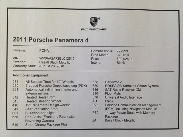 2011 PORSCHE PANAMERA 4 AWD ONE OWNER CERTIFIED PRE-OWNED PORSCHE WARRANTY