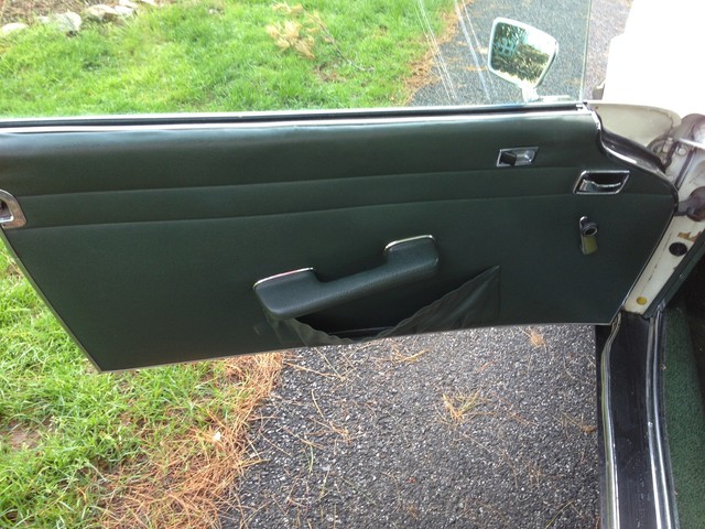 The interior is a beautiful green leather. Drivers seat is worn, we have an estimate to re-stuff/upholster for $450. Otherwise interior is a 10! Carpet looks like original pile carpet, but we cant be sure.