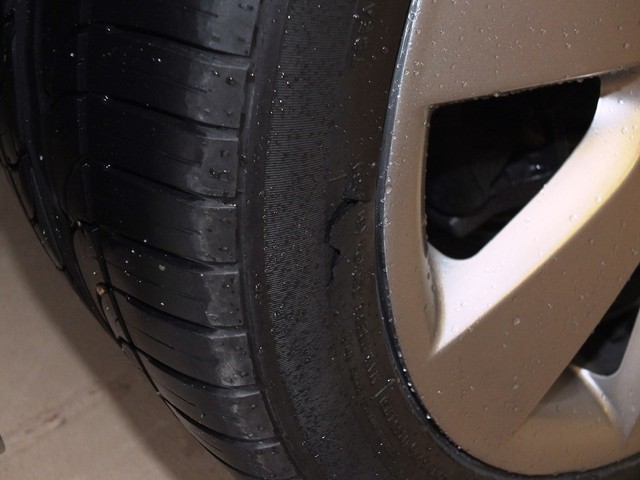 THE 18'' ALLOY WHEELS LOOK VERY GOOD (RIGHT REAR HAS TWO PAINT CHIPS). THE TIRES HAVE ABOUT 50% OF THEIR TREAD REMAINING IN THE FRONT, AND 50% IN THE LEFT REAR TIRE, BUT ONLY 40% IN THE RIGHT REAR TIRE. THE RIGHT REAR TIRE HAS A CUT ON THE SIDEWALL (SEE PIC), BUT IT IS SUPERFICIAL AND IS NOT LEAKING AIR. HOWEVER, WE DO RECOMMEND REPLACING THIS TIRE.