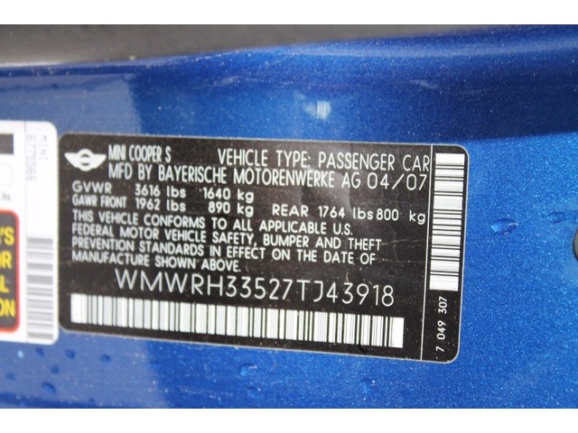 How about this fast fact? Named for John Cooper, an aftermarket tuner who applied his skills to the original Minis in the 1960s and whose shop is still in existence - just in case you wondered... Power for this flagship, 2007 Convertible is provided by a 1.6-liter four-cylinder engine with 6-speed manual transmission, that gets you great mpg and is just fun to drive. This MINI Cooper S is well-equipped with such features as leather upholstery with heated front seats, air conditioning, power windows, power door locks, dual front and side airbags, an AM/FM stereo system with a CD player, remote key-less entry, and anti-lock brakes. You have seen these in movies for years and have seen them personalized with checkers, flags, and stripes allowing owners to make their Cooper rock to their own tune. We give this MINI Cooper high marks - it belongs on your short list! Print this page and call us Now... We Know You Will Enjoy Your Test Drive Towards Ownership!