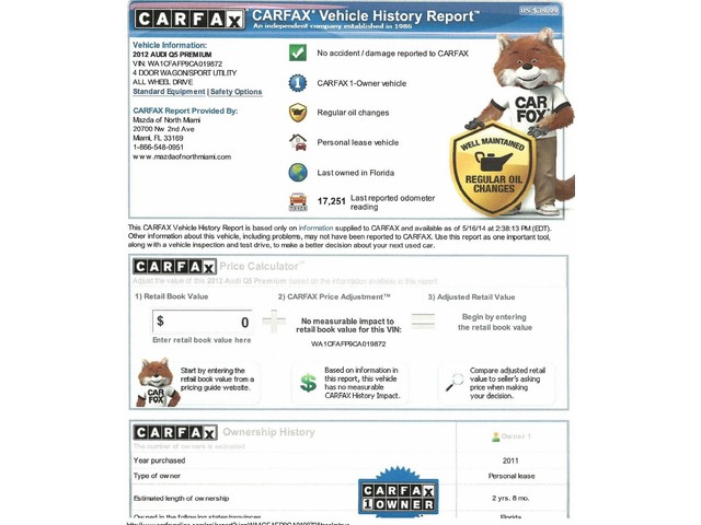 2012 Q5 QUATTRO PREMIUM LEATHER PANO ROOF CARFAX CERTIFIED ONE FL OWNER WARRANT