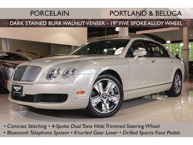 2008 Bentley Continental Flying Spur in Porcelain with Portland hide interior, Beluga secondary hide and Dark Stained Burr Walnut Veneer. Additional features include Contrast Stitching, 4-Spoke Dual Tone Hide Trimmed Steering Wheel, Deep Pile Overmats To Front and Rear, Drilled Alloy Sports Foot Pedals, Sports Gear Lever, Bluetooth Telephone System With Remote SIM Access Profile - With Privacy Handset and 19" Five Spoke Alloy Wheel - Chromed.
