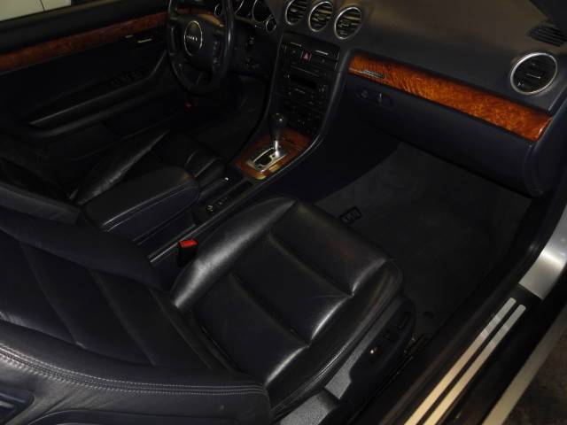 What a pretty Audi A4 Convertible we have to offer this week. This Audi was traded on a new car. It's finished in silver gray metallic with navy blue leather interior and a blue cloth top.