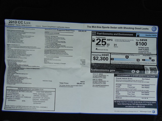 2013 Volkswagen CC  2.0L Turbocharged TSI LUX