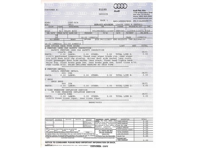 2004 Volvo XC90 2.5T Turbo SUV. Only 110K Miles. These are vehicles that fall outside of Audi Palo Alto’s Strict Used Car guidelines. These are generally Higher Mileage, Older, Lower-Priced vehicles that are perhaps 'Flawed' in some way. They are sold with a vehicle Inspection Indicating the mechanical condition and any needed repairs. They have been fully detailed and the oil has been changed. They are sold without a warranty.They are offered for a limited time only 21-30 days. They are sold 100% AS-IS without promise of after the sale work. They are sold with our 'Best Price' posted on the windshield and on-line. Audi Palo Alto 1730 Embarcadero Road, Palo Alto, Ca 94303 The “New” Audi Palo Alto
