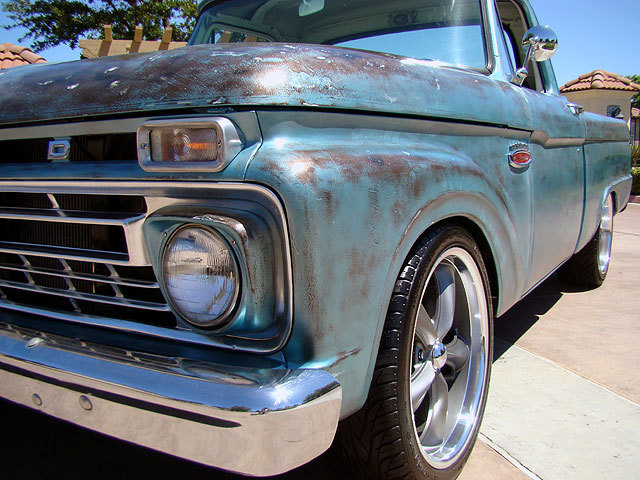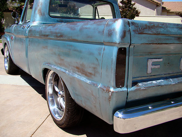 Truck is rust free with a fresh Faux Patina paint then polished. New rear bumper, side mirrors, billet antenna, side bezels and carpet.